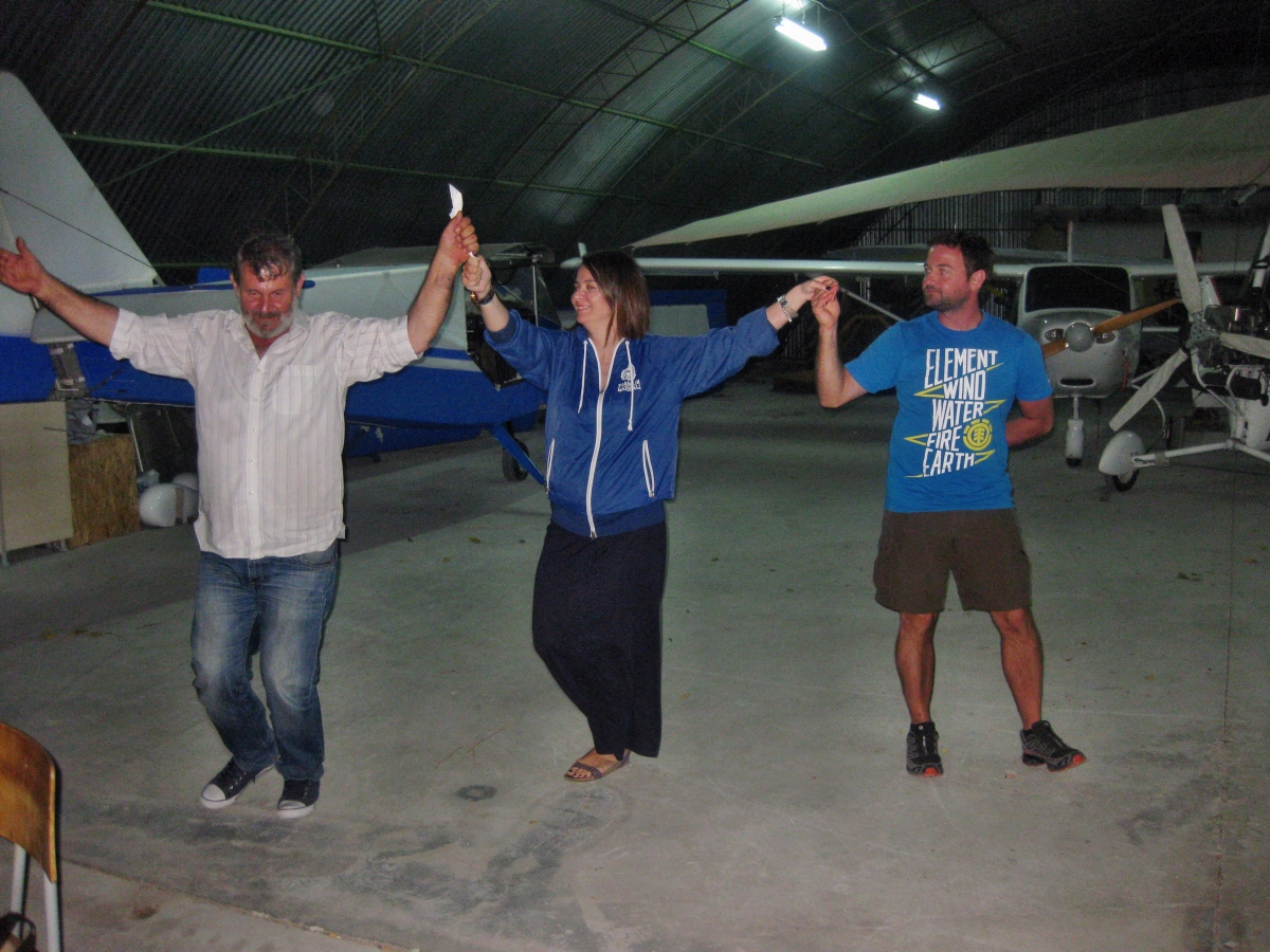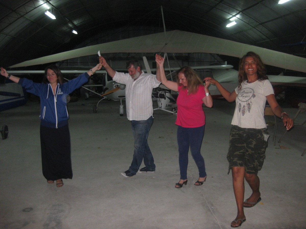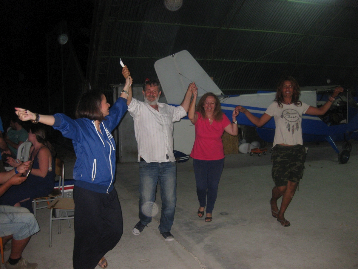 Στην παρέα προστέθηκε και ζευγάρι Ελβετών οι οποίοι περνούσαν τυχαία απο το Αγρίνιο το απόγευμα και βλέποντας τους Αλεξιπτωτιστές Πλαγιάς να πετάνε απο την Βλαχέρνα, σταμάτησαν για να πετάξουν και αυτοί (είναι εκπαιδευτές parapente) και να διαπιστώσουν τις συνθήκες πτήσεων στην περιοχή μας. Ετσι προσκλήθηκαν απο μέλη της λέσχης στο βραδυνό "γλέντι υπο την πανσέληνο" στο Αεροδρόμιο και μας τίμησαν με την παρουσία τους.