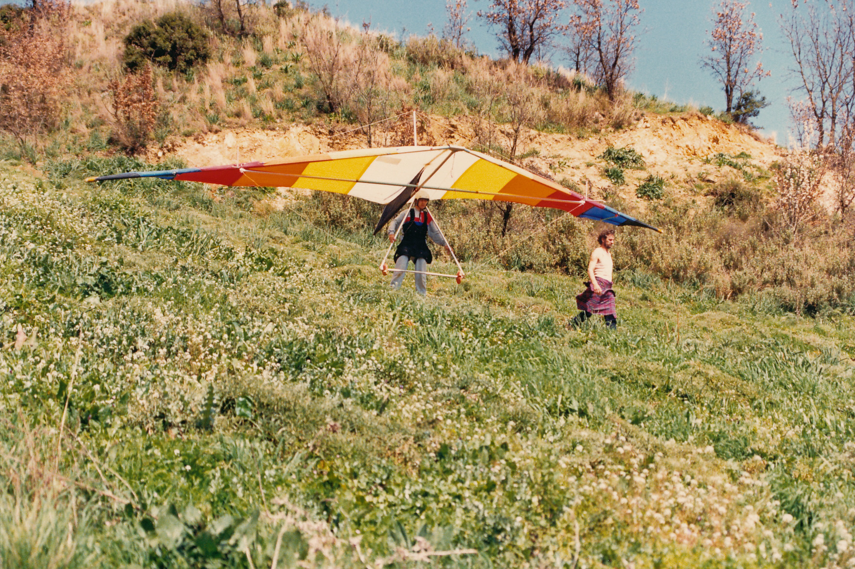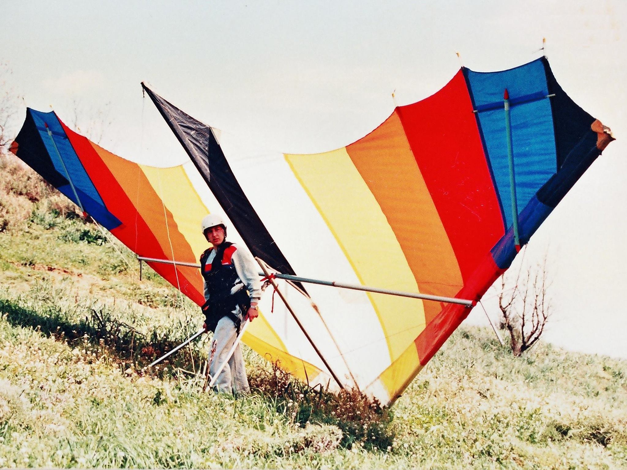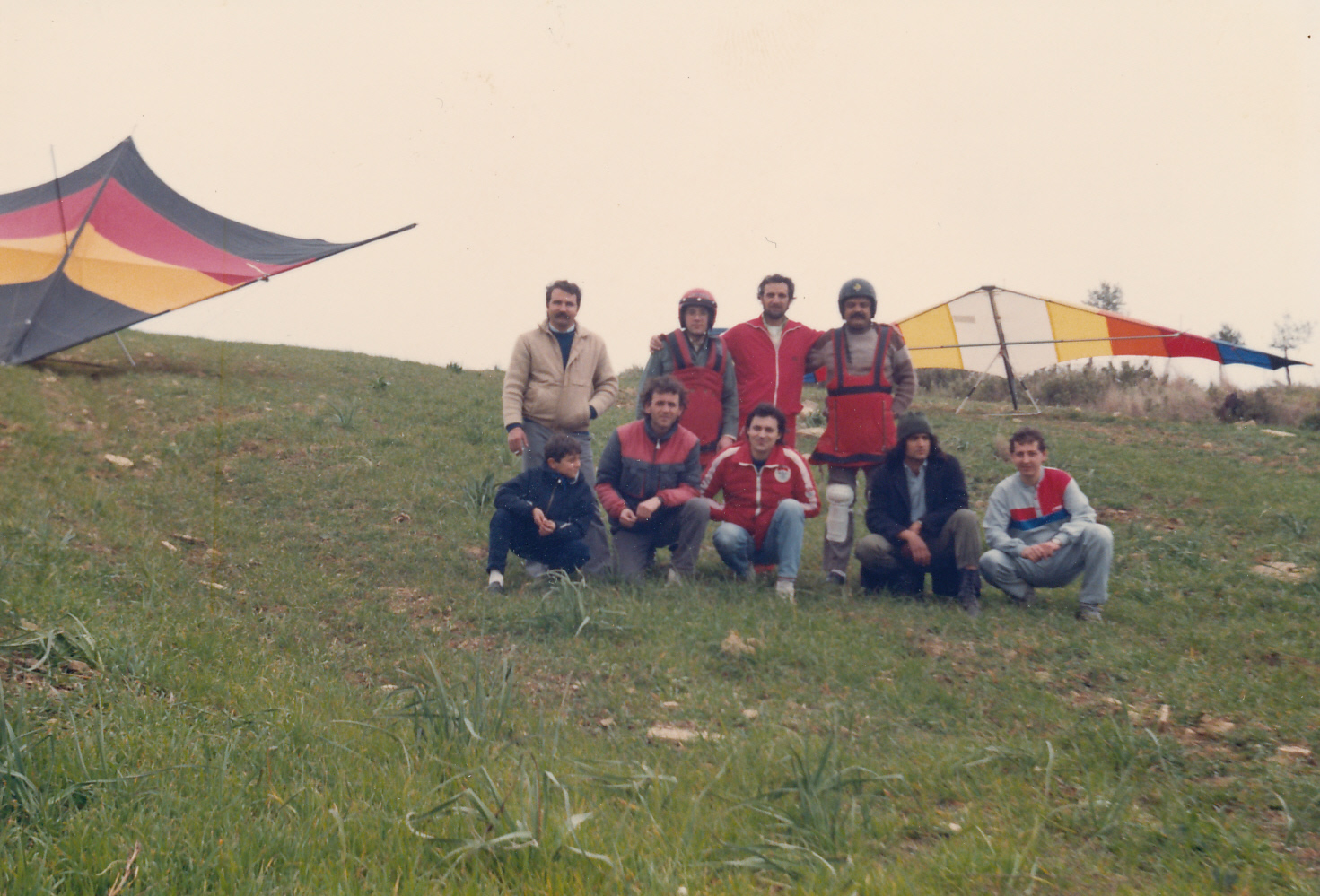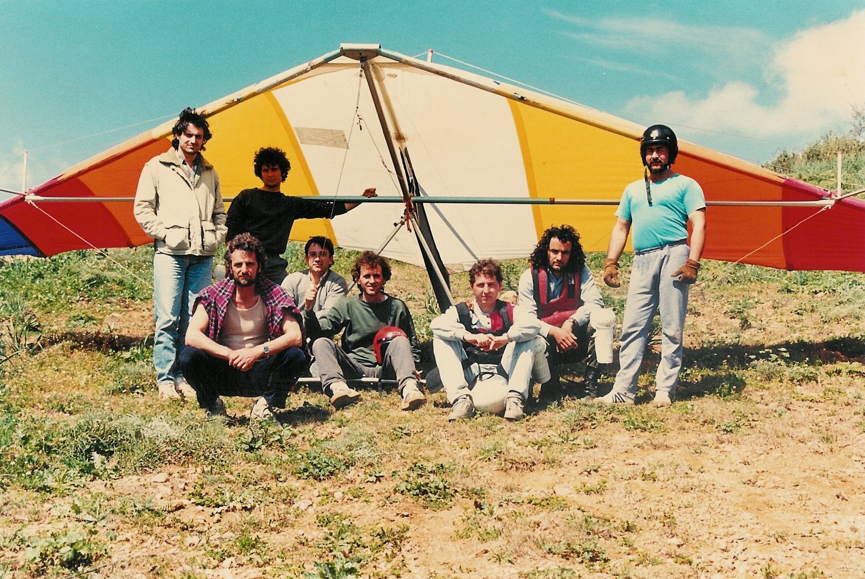Απρίλιος 1987. Η πρώτη ομάδα της Αερολέσχης Αγρινίου που ξεκίνησε πτήσεις με Αιωρόπτερο (Αετός βουνού). Απο αριστερά ορθιοι οι Κώστας Ρήγας (τον δεύτερο δεν τον θυμάμαι) και δεξιά όρθιος ο Γιώργος Μπαριάμης. Καθιστοί ο εκπαιδευτής μας Δημήτρης Σδούκος, Ο Λεωνίδας Κότσαρης, ο Γιώργος Λειβαδίτης, Ο Κων/νος Σαμψών και ο Σπύρος Θεοδοσίου.